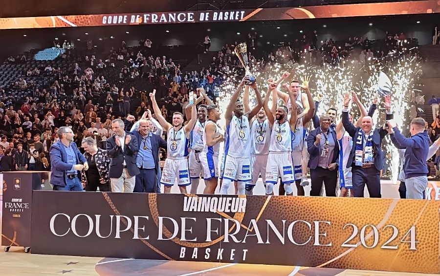 Avec le Pays de Fougères Basket, c’est « on vient chaque printemps à l’Accor Aréna de Paris Bercy, on gagne et on s’en va »… avec le trophée. Après avoir battu le Toulouse OAC (NM3) en 2022 puis Beaujolais Basket (NM2) en 2023, les joueurs d’Ille-et-Vilaine se sont offerts le scalp du Club Sportif Gravenchonnais avec lequel il avaient partagé les succès cette saison en championnat. A l’image du score final, plusieurs données sont là pour le confirmer, les deux rivaux étaient très très proches pour cette “belle” : 89 (Fougères) à 84 au niveau de l’évaluation, 38 à 39 (rebonds), 18 à 21 (passes décisives)… Tout s’est joué dans les dernières secondes avec le ballon de l’égalisation à 77-77 (raté) pour Cauwet, à créditer de 32 points par ailleurs, un 2/2 aux lancers pour recoller à 77-76 à 4″8 (plutôt que de miser sur un rebond offensif sur le 2e lancer ?) avant un temps-mort, puis un 0/2 de Fougères aux lancers et un tir désespérado de Gravenchon, en vain. Pour la troisième fois, le théâtral Mathieu Lemercier tombait dans les bras de ses joueurs et du président Laurent Coudray pour des effusions de joie tellement légitimes avant d’aller partager leur bonheur et de communier avec leurs 1.500 supporters (sur un total juste remarquable de 7.656 à l’Accor Aréna). Avant d’en arriver là, les deux formations s’étaient livrées à un sacré mano à mano, tantôt à l’avantage du Pays de Fougères (23-19, 10e, 61-60, 30e), tantôt à celui de Gravenchon (39-45, mi-temps, 41-49, 23e). Et si le meilleur marqueur figurait dans le camp des vaincus avec un Cauwel trop esseulé aux côtés du capitaine Le Borloch (14 pts), le Pays de Fougères pouvait s’appuyer sur quatre scoreurs entre 10 et 18 points dont Maxime Choplin, le MVP (18 pts, 3 rebonds, 5 passes décisives, 6 fautes provoquées) d’une finale qui restera dans les annales à… plus d’un titre. L’accession en N1M à travers des barrages face à un 2e de groupe est désormais l’objectif de Fougères,en espérant s’éviter les frayeurs de l’Accor Aréna.