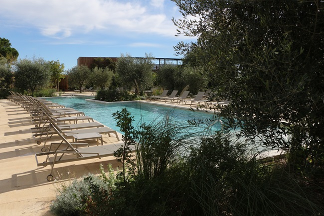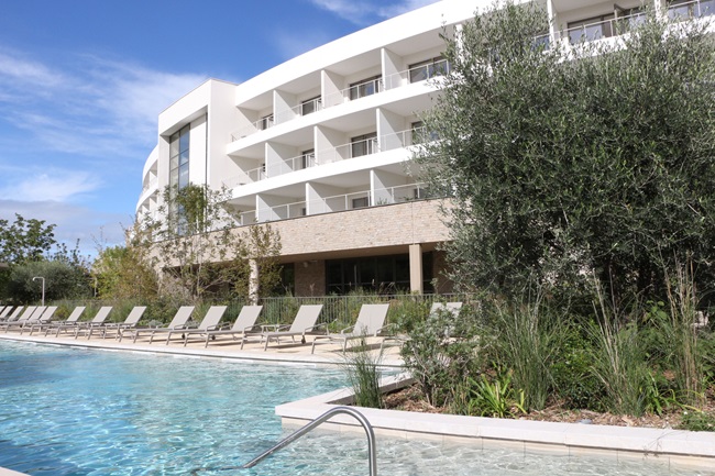 L’objectif, l’ambition du groupe Eoden, à savoir transformer le site sous divers aspects, tout en ne faisant pas table rase du passé et en conservant histoire, valeurs fondatrices, héritage… Laurette Lapeine, la directrice d’Horizon Ressort Massane, les partage à 200% : « L’idée est d’en faire un lieu de vie avec différents segments de vie. Je suis dans l’humain, très sensible à la symétrie des attentions. Je tiens à ce que nous soyons dans la proximité, avec une différenciation de l’accueil mais la volonté de soigner tout le monde. Il y a aussi cette obligation d’être à la hauteur de nos prestations. » Et dieu sait que l’offre est complète, haut de gamme et écoresponsable. Sur le plan de l’hôtellerie, savoureux cocktail de luxe et d’engagement environnemental, confiée au cabinet d’architecture Mégias-Vernhes, basé à Aigues-Mortes, on recense ainsi 84 chambres – avec des supports 100% digitaux – dont 6 suites, 39 appartements (du studio au T3) issus de l’ancienne résidence ainsi qu’une villa d’exception dénommée… Villa Massane. L’architecture intérieure du lieu a été portée par Damien Carreres en collaboration avec Alexandre Boulin, des architectes d’intérieur designers plasticiens. Grands volumes, vastes terrasses toutes exposées sud-est avec vue sur le golf, grandes baies vitrées et structures jouant la transparence, lumière naturelle baignant dans chaque chambre, matériaux choisis avec soin, lignes courbes (un défi technique dixit l’un des architectes)… créent une atmosphère tout à la fois apaisante et chaleureuse, ce qui justifie la volonté de faire de l’hôtel un exemple pour le tourisme de demain.