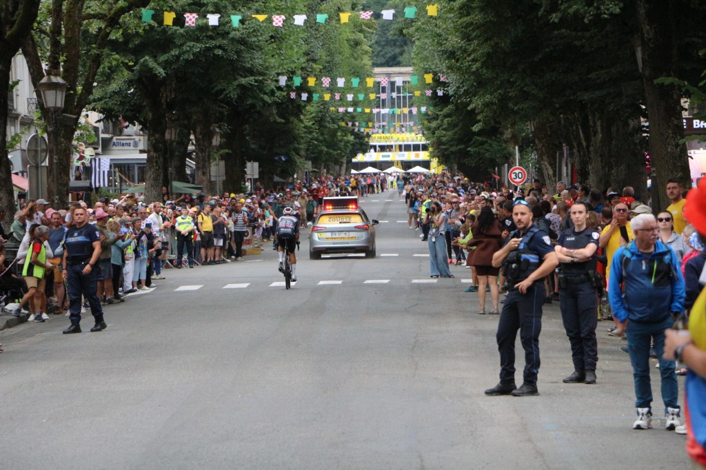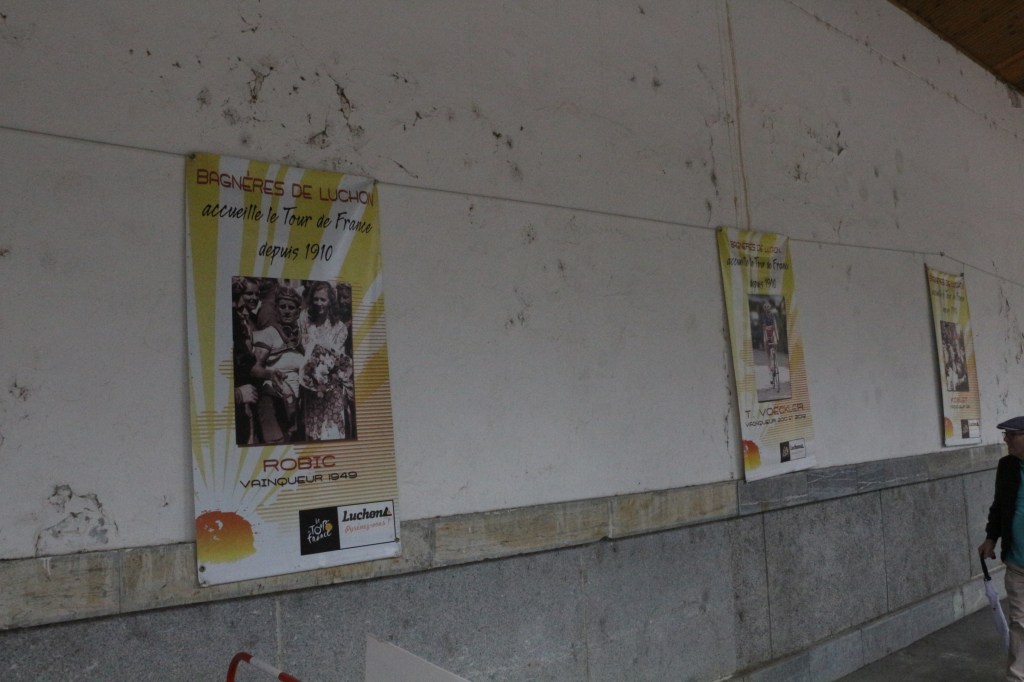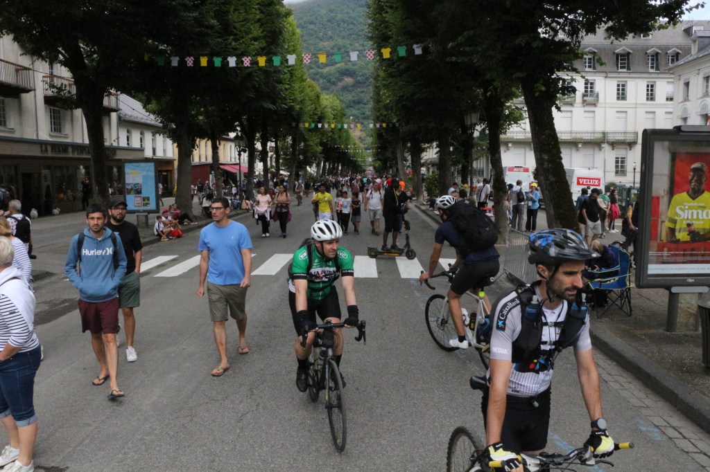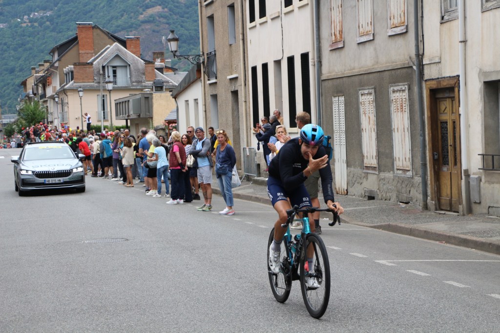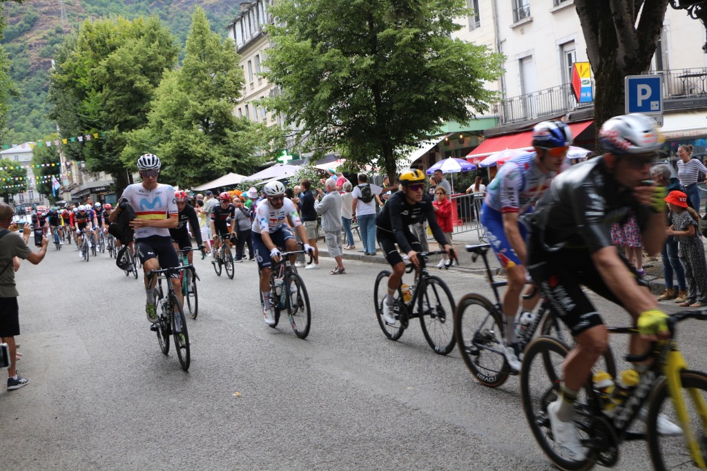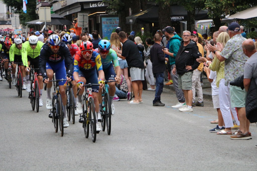 Conclusion de la 14ème étape partie de Pau, Luchon-SuperBagnères a vécu intensément cette énième venue depuis l’acte I en 1910. Habillée aux couleurs du Tour dans de multiples commerces, la cité du Comminges envahie depuis plusieurs jours par de nombreux étrangers, inondée sur de nombreuses artères de cyclistes se prenant sans doute pour les Pogacar de demain, aura vibré comme rarement. Après s’être avalé les cols du Tourmalet et d’Aspin, le peloton, très disséminé dans la descente du col de Peyresourde (7,1 km à 7,8%, 1569 m) a traversé à belle allure les fameuses Allées d’Etigny, coeur de Luchon, avant un ultime effort soutenu avec la montée finale pas anodine et, dans le brouillard à SuperBagnères (12,4 km à 7,3%, 1804 m)… 64 ans après la première arrivée d’étape sur le même site, les plus anciens s’en souviennent encore, sous la tempête, de véritables bourrasques ayant alors balayé tout à la fois banderole d’arrivée, podium et parasols. En cette année 1961, avec un Jacques Anquetil en jaune, c’est l’Italien Imerio Massignan (sacré meilleur grimpeur) qui l’avait du reste emporté. Ce samedi 19 juillet, son successeur avait pour nom Thymen Arensman,un Hollandais de 25 ans, pointé 1 »8 devant un certain Tadej Pogacar, le maillot jaune slovène, enrhumé, davantage dans la gestion que dans la quête d’un nouveau succès d’étape. Mais plutôt que de vous inonder de chiffres, de temps, de classements divers et variés, de primes… et alors que le Tour de France est dans la dernière ligne droite, retour en photos sur cette 14e étape de 182,6 km qui aura laissé des traces à Luchon-SuperBagnères.