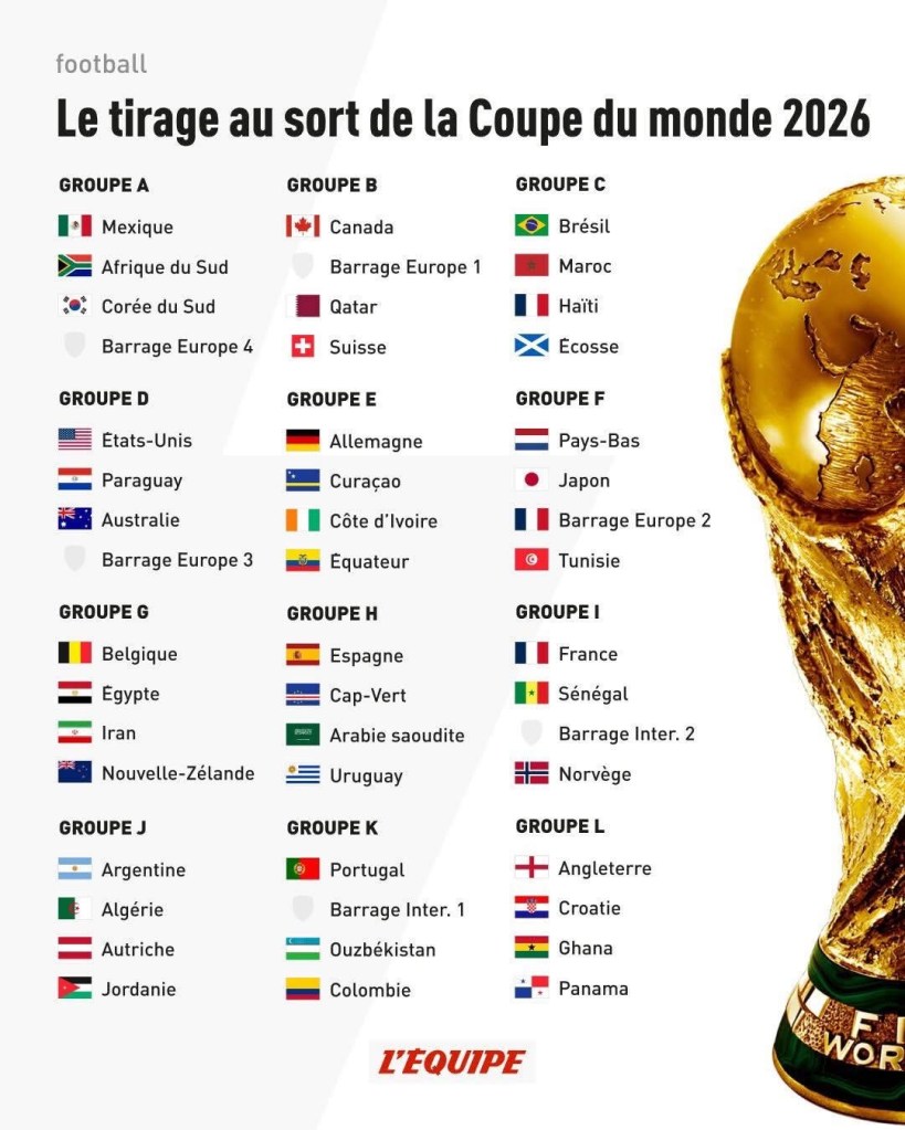 La fameuse « chatte » à Dédé n’a pas dû obtenir de visa pour le tirage au sort à Washington. Très souvent gâtée lors des tirages au sort de la grande majorité des compétitions,l’équipe de France l’a moins été cette fois-ci ! Kylian M’Bappé et ses coéquipiers, placés dans le groupe I, affronteront dans l’ordre le Sénégal (19e au classement FIFA) le mardi 16 juin à New-York à 21 h (heure française), un qualifié « à choisir » entre la Bolivie (76e), l’Irak (58e) et le Surinam (123e) le lundi 22 juin à Philadelphie à 23 h, enfin la Norvège (29e) le vendredi 26 juin à Boston à 21 h.